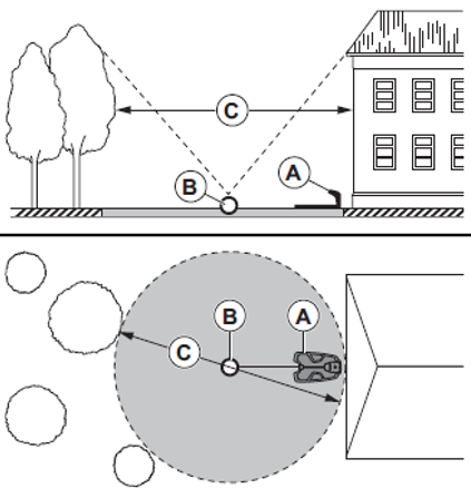Positioniere die Ladestation (A) so, dass beim Andockpunkt (B) immer eine freie Sicht zum Himmel gewährleistet ist.