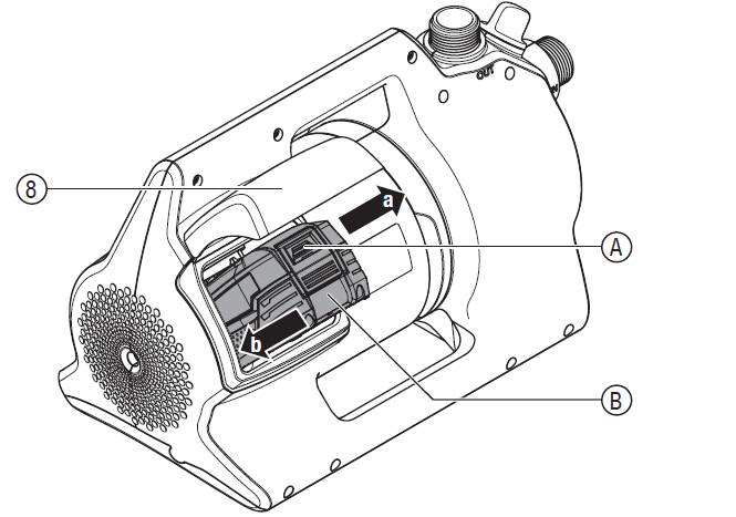 Wie kann ich den Akku aus dem Akkufach entnehmen? 14. April 2026 13:40 Aktualisiert 1. öffnen Sie den Deckel (8) 2. Drücken Sie die Entriegelungs-Taste (A) und entnehmen Sie den Akku (B) aus dem Akku-Schacht