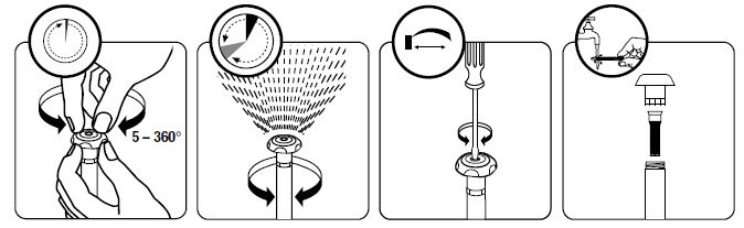 Um die Wurfweite einzustellen muss die Schraube in der Mitte der Düse gedreht werden. Die Einstellung wird auch auf der Verpackung abgebildet.
